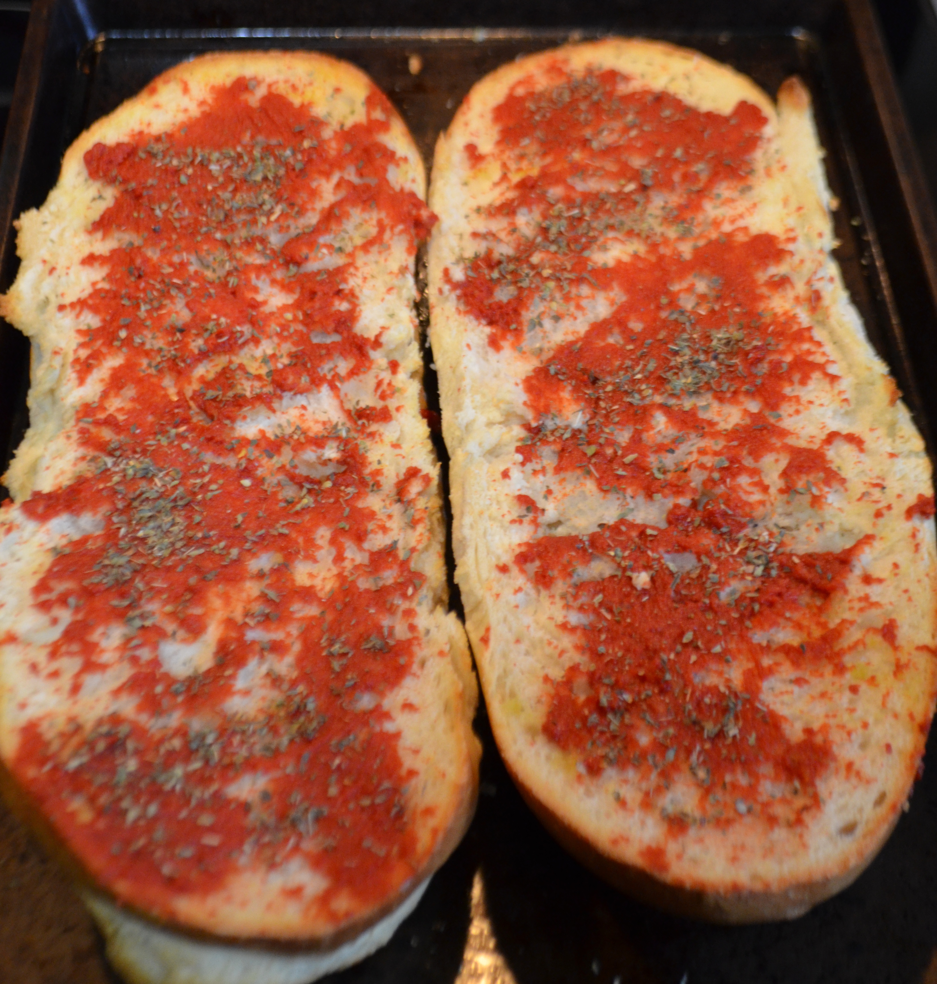 - Remove from the oven and brush with tomato paste. Sprinkle with basil and oregano, and the grated cheese.
