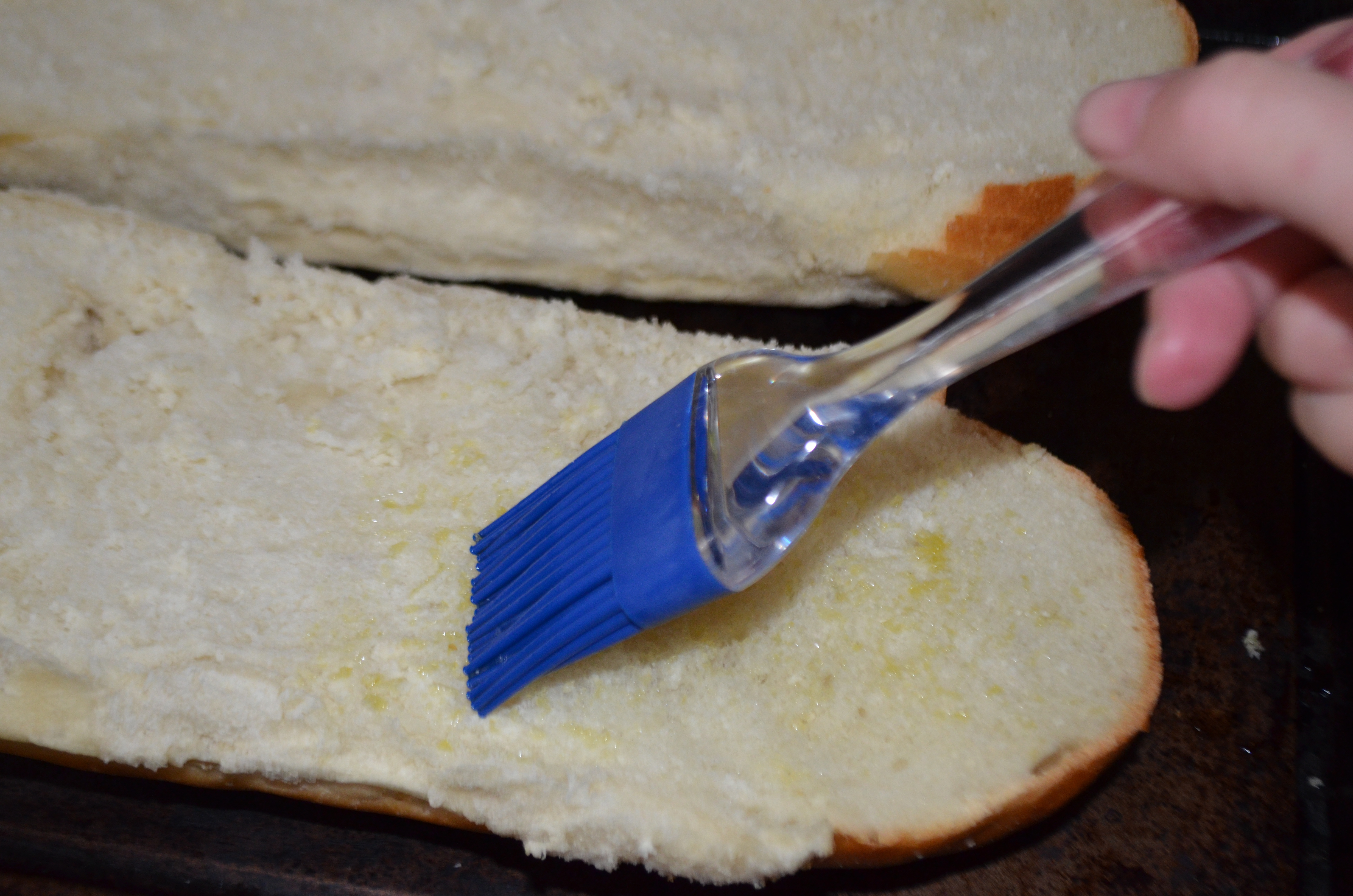 - Slice the bread in half lengthwise and brush with olive oil. Place on a baking sheet at the center of the oven and toast for five minutes.